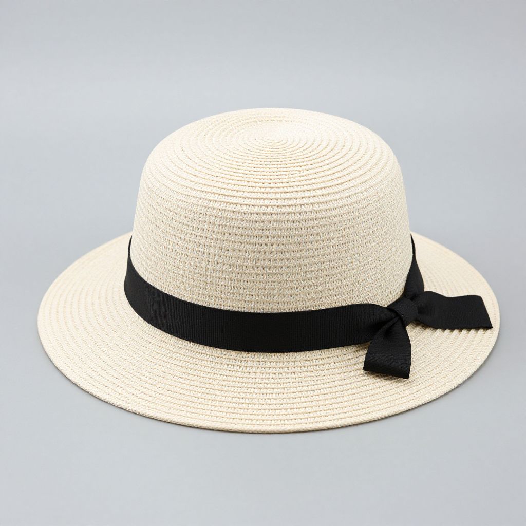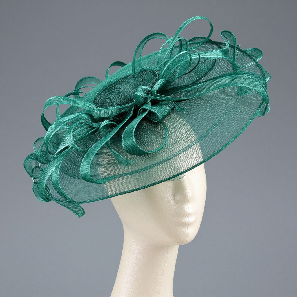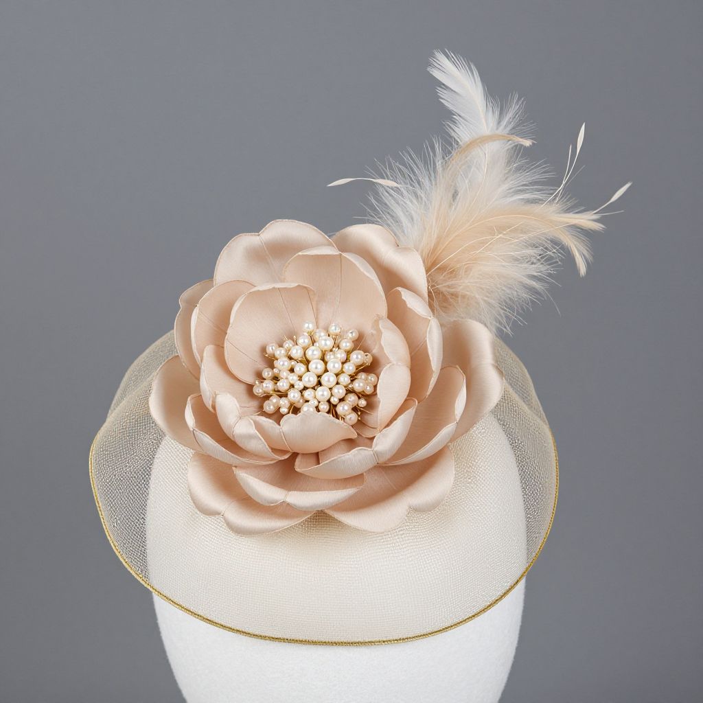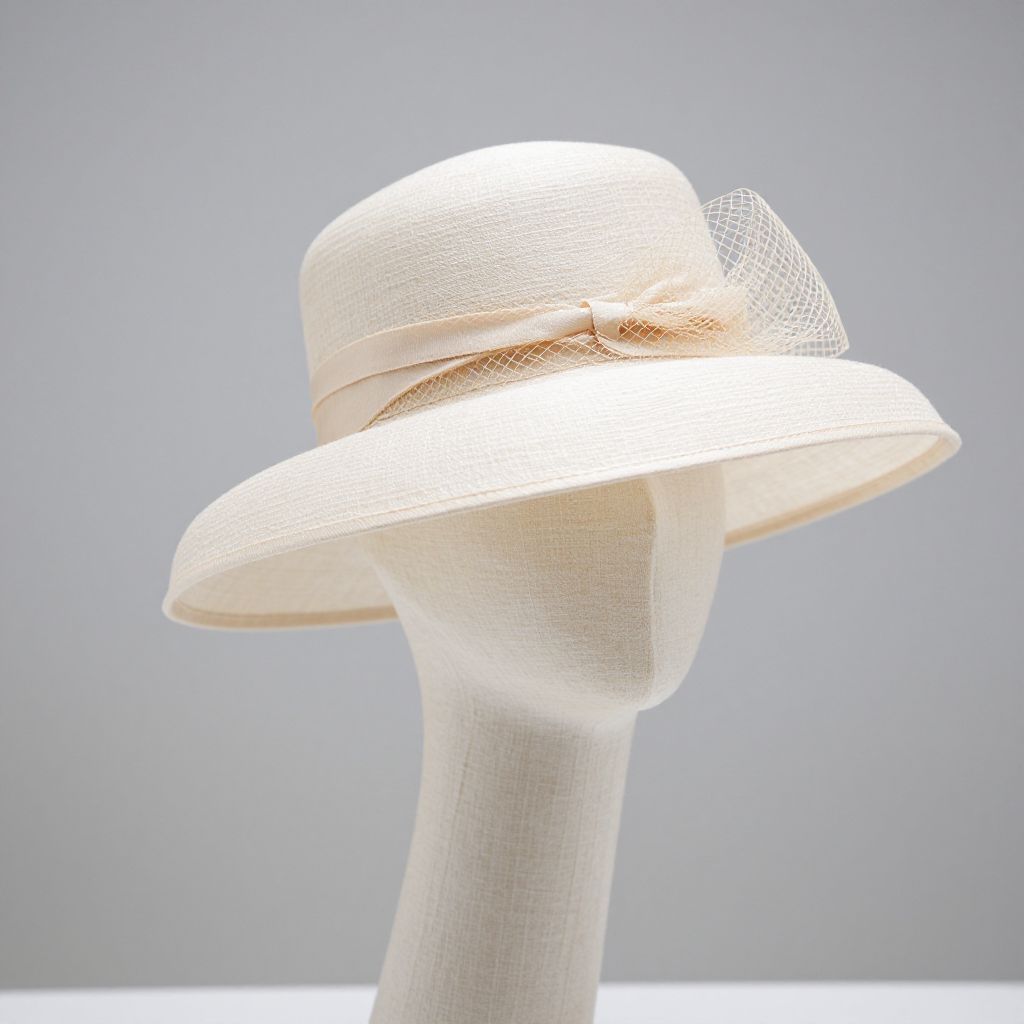 Elegant navy-blue Edwardian-style tea hat featuring a wide brim, a central black netted flower embellishment, and a delicate ribbon accent, showcased on a mannequin head against a neutral background.