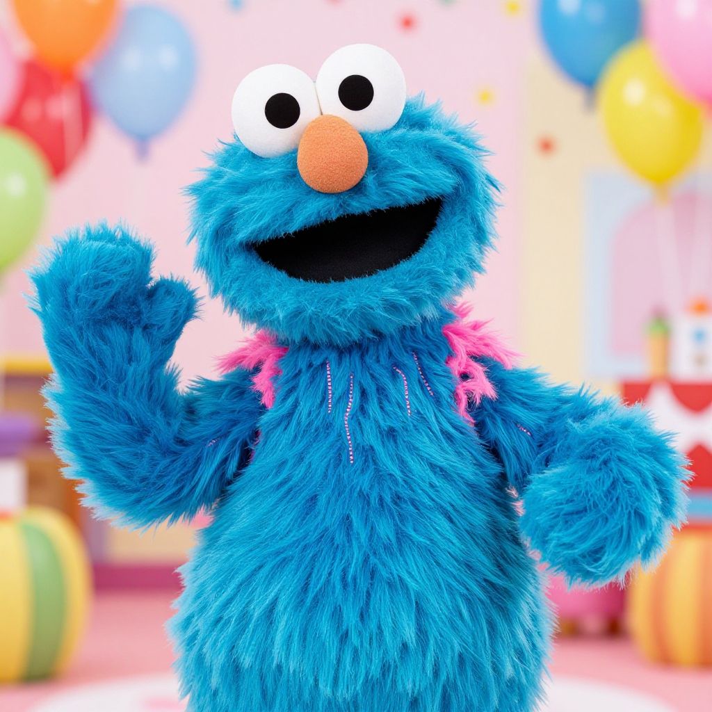 Rosita Sesame Street costume detailed close-up, vibrant turquoise fur texture with pink accents, playful pose in colorful children's party setting, bright and cheerful lighting, ultra-realistic fabric folds and stitching, whimsical background with balloons and confetti