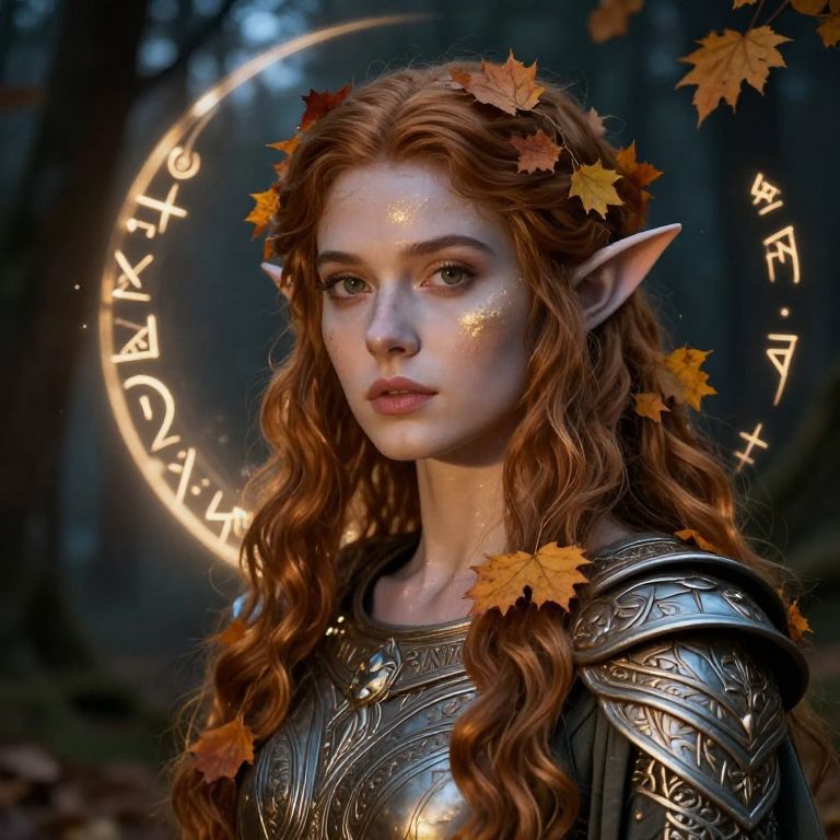 Digital artwork of a fair-skinned, red-haired elf woman with pointed ears, wearing ornate silver armor, surrounded by glowing runes and autumn leaves in