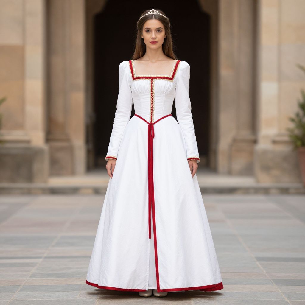 "Woman Medieval Princess Costume, woman in a white dress with a red trim"