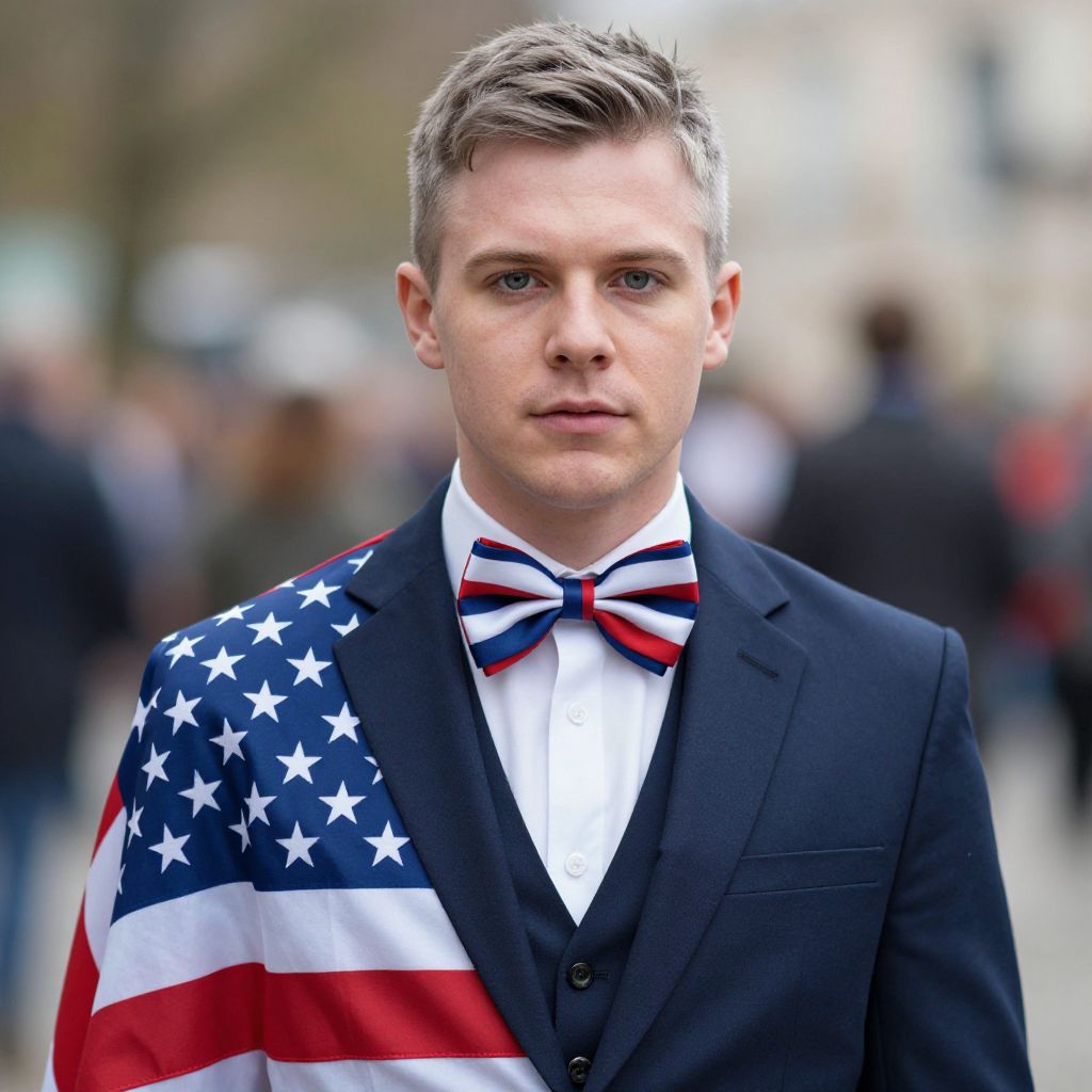 British icons fancy dress, male focus, 1boy, solo, realistic, blurry background, blurry, looking at viewer, vest, jacket, american flag, bow, upper body, formal, bowtie, blue eyes, striped bow, suit, grey hair, photorealistic