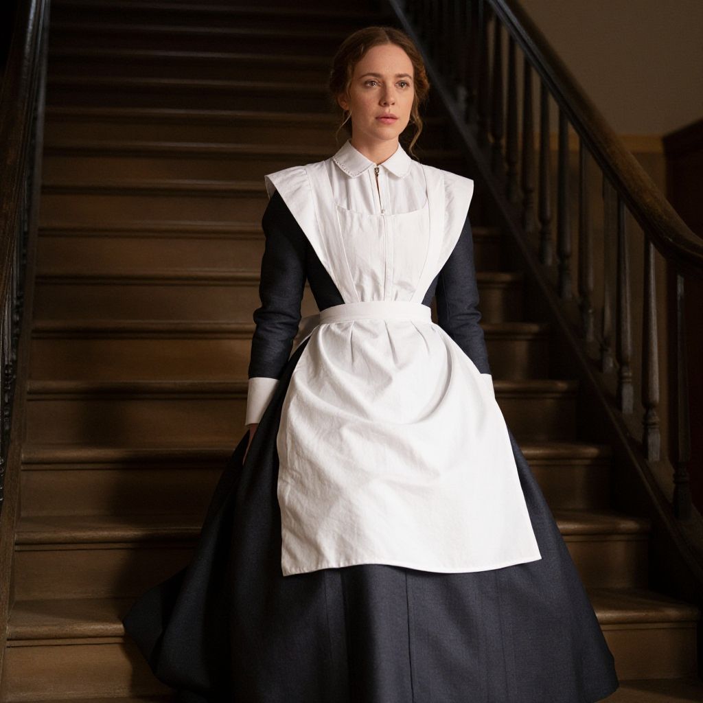 Alice Ayres costume, classic Victorian servant outfit with dark dress and white apron, subtle heroic aura, holding firefighting tools symbolizing bravery, rainy London street background, moody lighting and mist, highly detailed and textured, atmospheric historical portrait