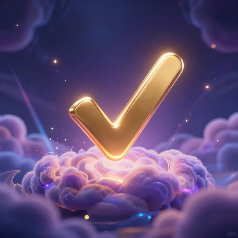 Floating golden checkmark icon surrounded by swirling clouds of color in a mystical fantasy environment, glowing particles and magical light beams, surreal atmosphere, rich color palette with purples and blues