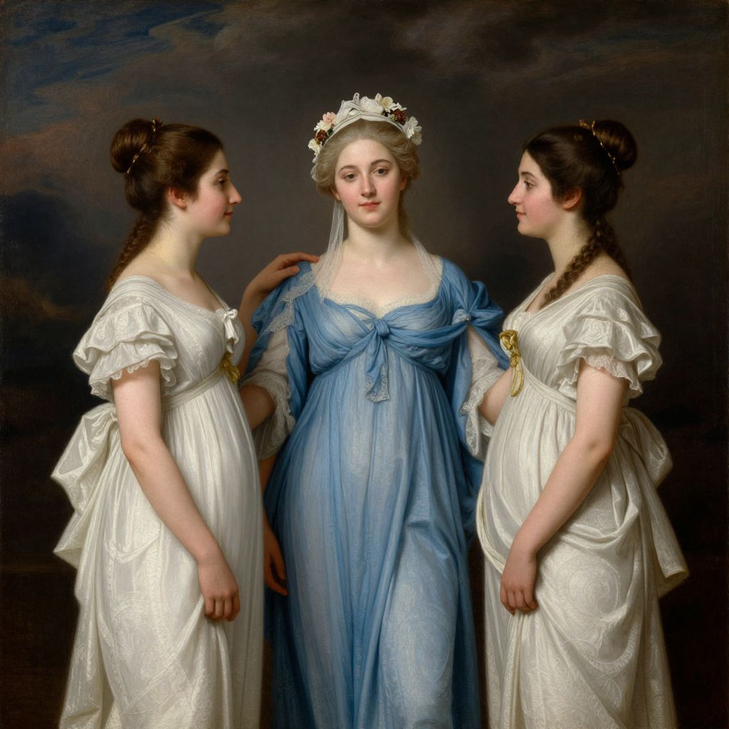 The image depicts a classical oil painting in the style of Jean-Auguste-Dominique Ingres, reminiscent of \"The Three Graces.\" Three elegantly dressed women stand in a harmonious composition, their figures arranged in a triangular formation that draws the viewer's eye to the central figure. The woman in the center wears a flowing blue dress with a delicate white headpiece adorned with flowers, her face illuminated by a soft, ethereal light that contrasts with the darker, more muted tones of the background. The women's hair is styled in intricate, period-specific coiffures, adding to the regal and timeless quality of the scene. The background features a dark, cloud-filled sky, creating a dramatic backdrop that emphasizes the figures' prominence. The overall composition is balanced and serene, with each woman's posture and attire contributing to the cohesive and elegant aesthetic of the painting.