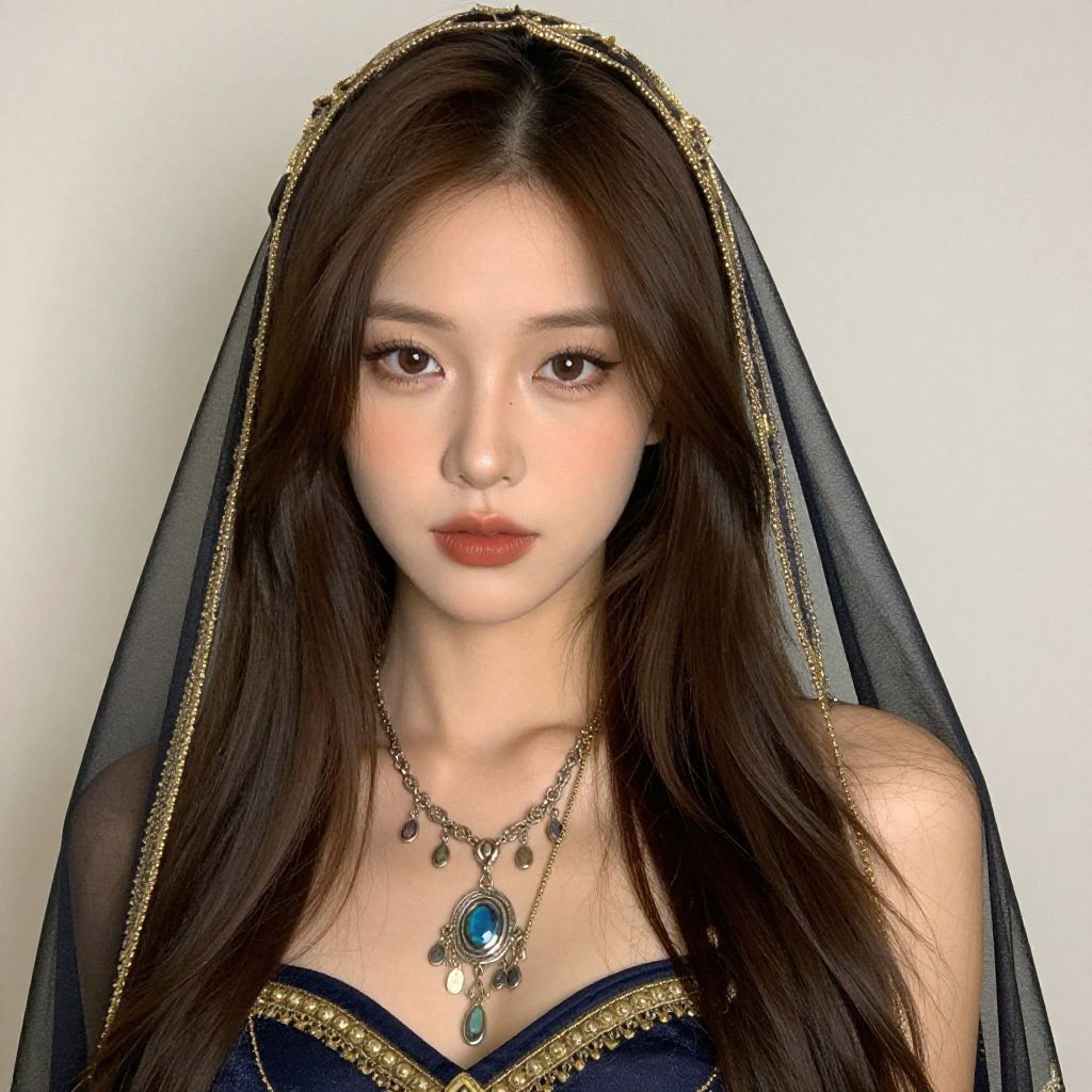 Arabian nights costume girl, 1girl, solo, jewelry, necklace, black hair, long hair, realistic, looking at viewer, headdress, upper body, blurry background, blurry