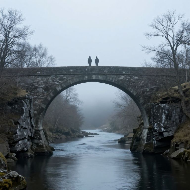 Photograph of a stone arch bridge spanning a calm river, with two silhouetted figures standing at the bridge's center. The bridge is made of dark, weathered stones, and the river reflects the overcast, gray sky. Leafless trees with spindly branches frame the bridge on both sides, and moss-covered rocks line the riverbanks. The background fades into a misty, foggy distance, adding a sense of depth and mystery. The overall color palette is muted, with shades of gray, blue, and brown, creating a serene, somewhat melancholic atmosphere.