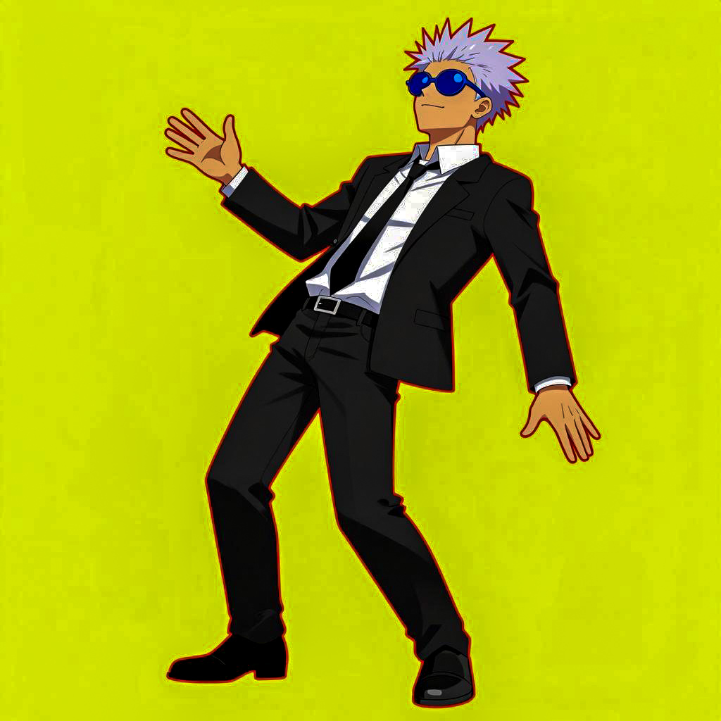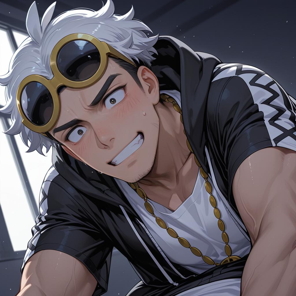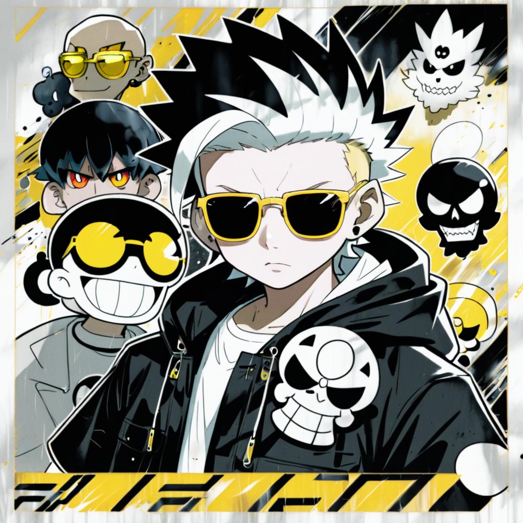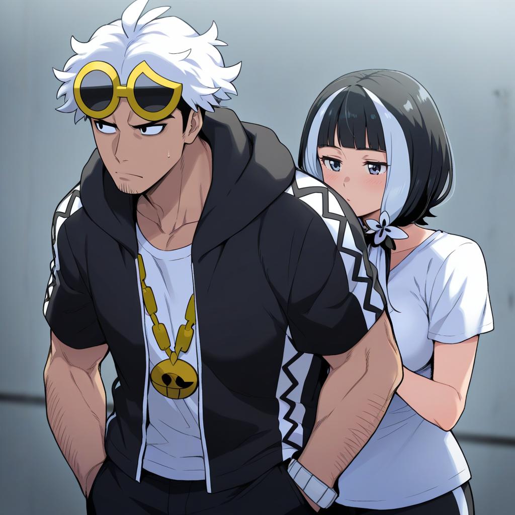 Guzma (pokemon), pokemon, 1boy, eyewear on head, yellow-framed eyewear, white hair, two-tone hair, black hair, short hair, sunglasses, hooded jacket, white shirt, black jacket, short sleeves, team skull, undercut, team skull, by artist chamaji, leet