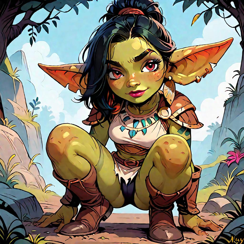 Score_9, score_8_up, score_7_up, score_6_up, anthro, goblin girl, green skin, tight ripped, squatting, tribal, armor, holding a spear