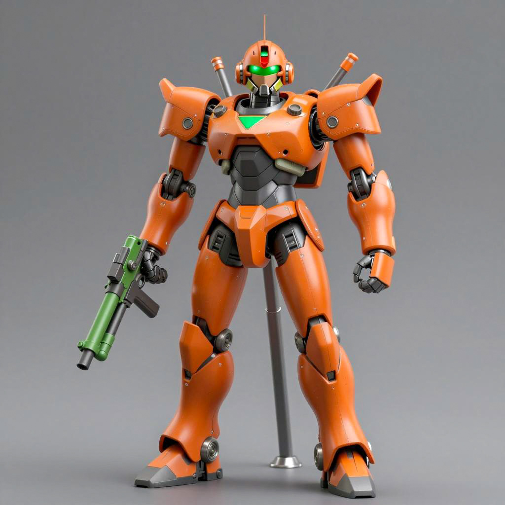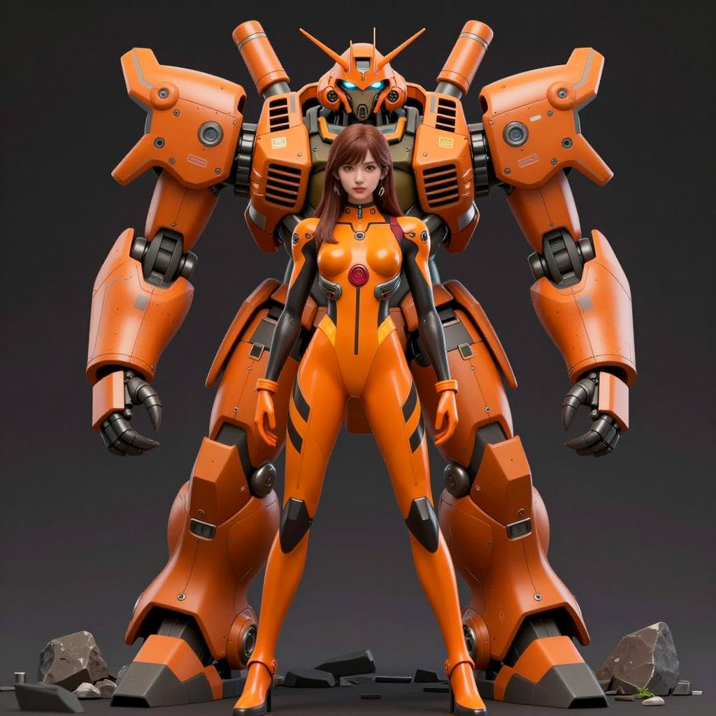 Digital illustration of a young woman in an orange and black futuristic bodysuit standing in front of a large orange and black mecha robot. She has long brown hair, a confident stance, and neutral facial expression. The mecha has large arms, claws, and a bulky design. Both are on a rocky base. The background is dark.