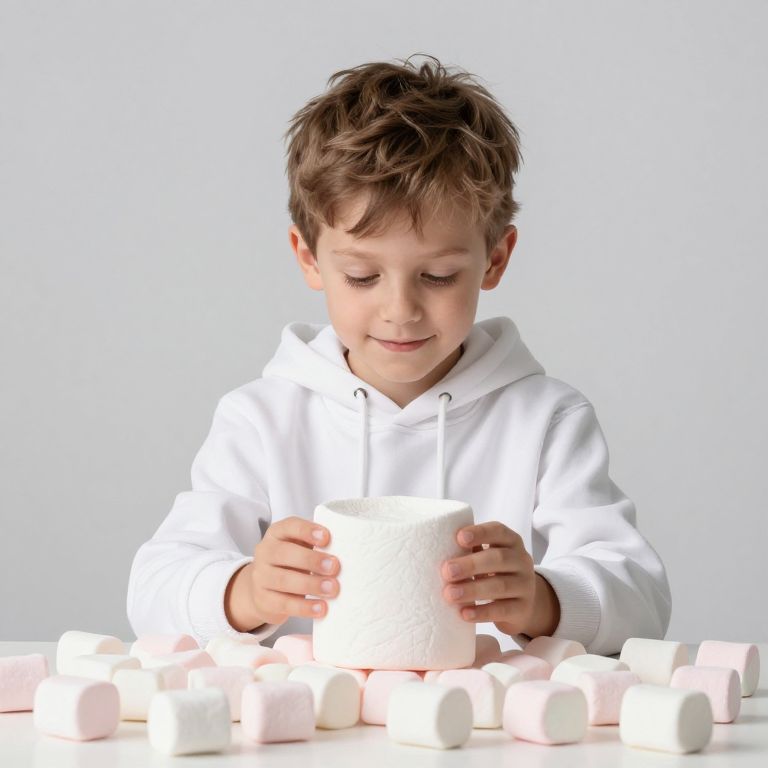 Photograph of a young boy with brown hair, wearing a white hoodie, smiling while holding a white marshmallow, surrounded by marshmallows on a