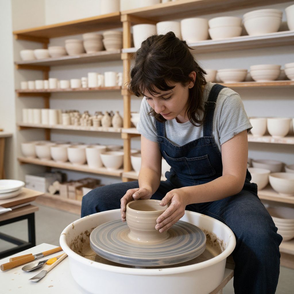 Woman crafting a clay pot on a pottery wheel in a well-lit workshop, surrounded by shelves filled with finished ceramic pieces and various tools.