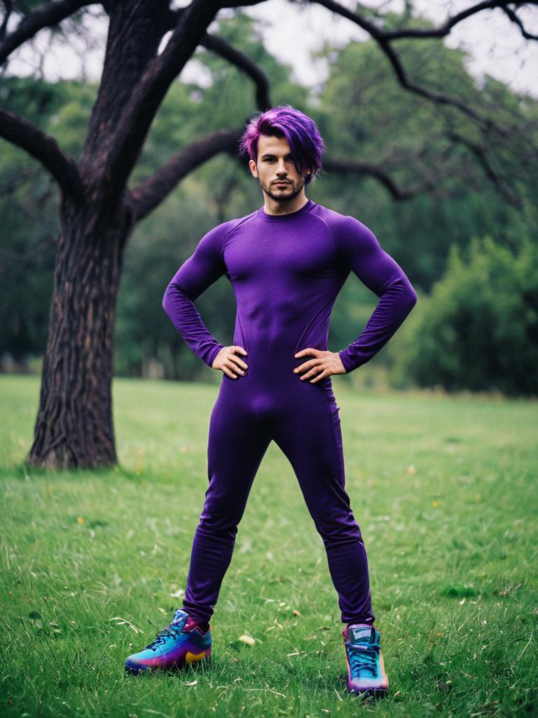 Purple costume rainbow, solo, outdoors, male focus, tree, standing, grass, 1boy, blurry, full body, shoes, blurry background, day, arms at sides, purple hair