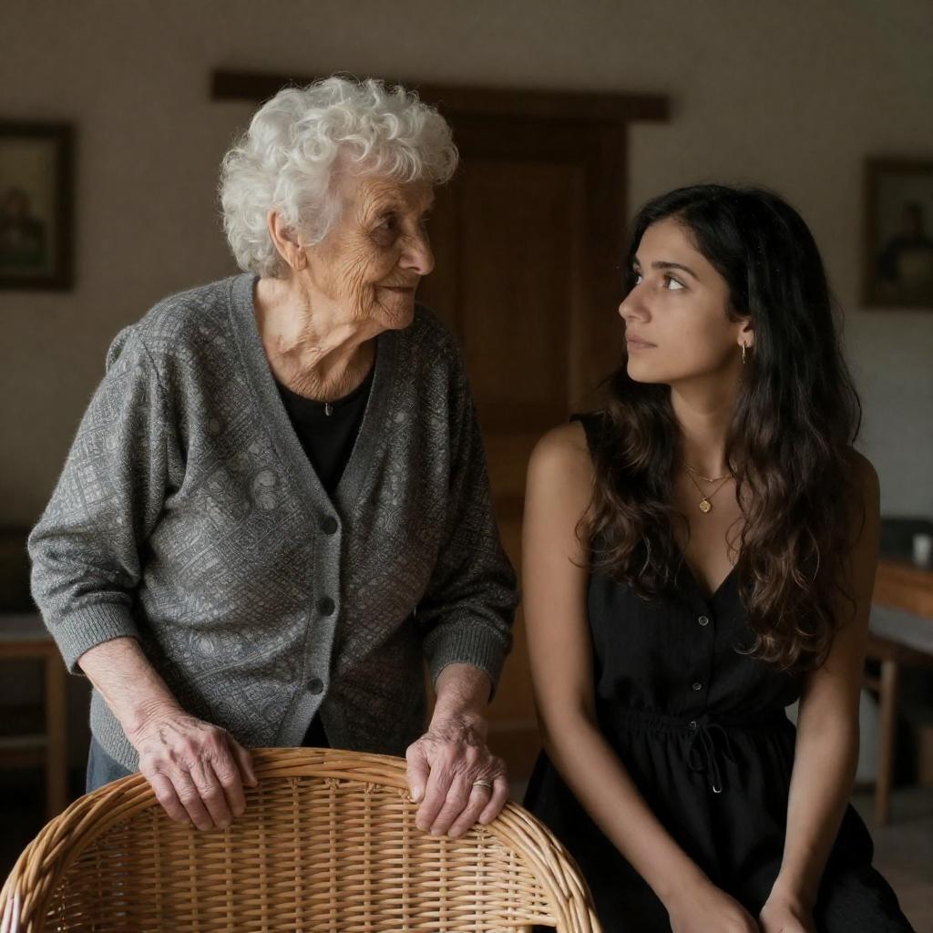 Portrait of an elderly Caucasian woman with white curly hair wearing a gray patterned cardigan over a black top, standing and leaning on a wicker chair. Beside her is a young woman with long dark hair, wearing a sleeveless black dress, sitting and looking up at the elderly woman. The background features a dimly lit, rustic interior with wooden furniture and framed pictures on the wall.