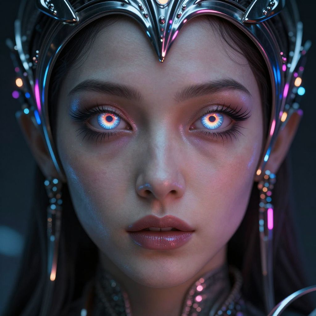 A superrealistic portrait captures the enigmatic gaze of an otherworldly being, blending Baroque grandeur with cyberpunk futurism. Framed by sleek, metallic headgear, the subject emanates an air of mystery and wisdom, their eyes a portal to a depth that challenges perception. Illuminated by the pulsating dance of neon lights reflecting off chrome, the scene captivates and disturbs in equal measure. Viewed from above, this portrait presents an entity that is at once alien and bewitching, merging the realms of science fiction and surrealism in a visually arresting exploration of human fascination with the unknown.