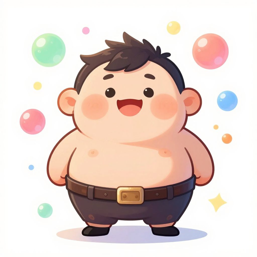 An AI fat filter effect on a fantasy character with chubby cheeks and a cheerful demeanor, illustrated in a whimsical cartoon style, surrounded by colorful floating orbs and soft shadows, evoking a lighthearted and adorable atmosphere.