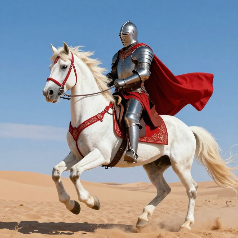 Photograph of a knight in silver armor with a red cape, riding a white horse with red harness, galloping through a desert under a clear
