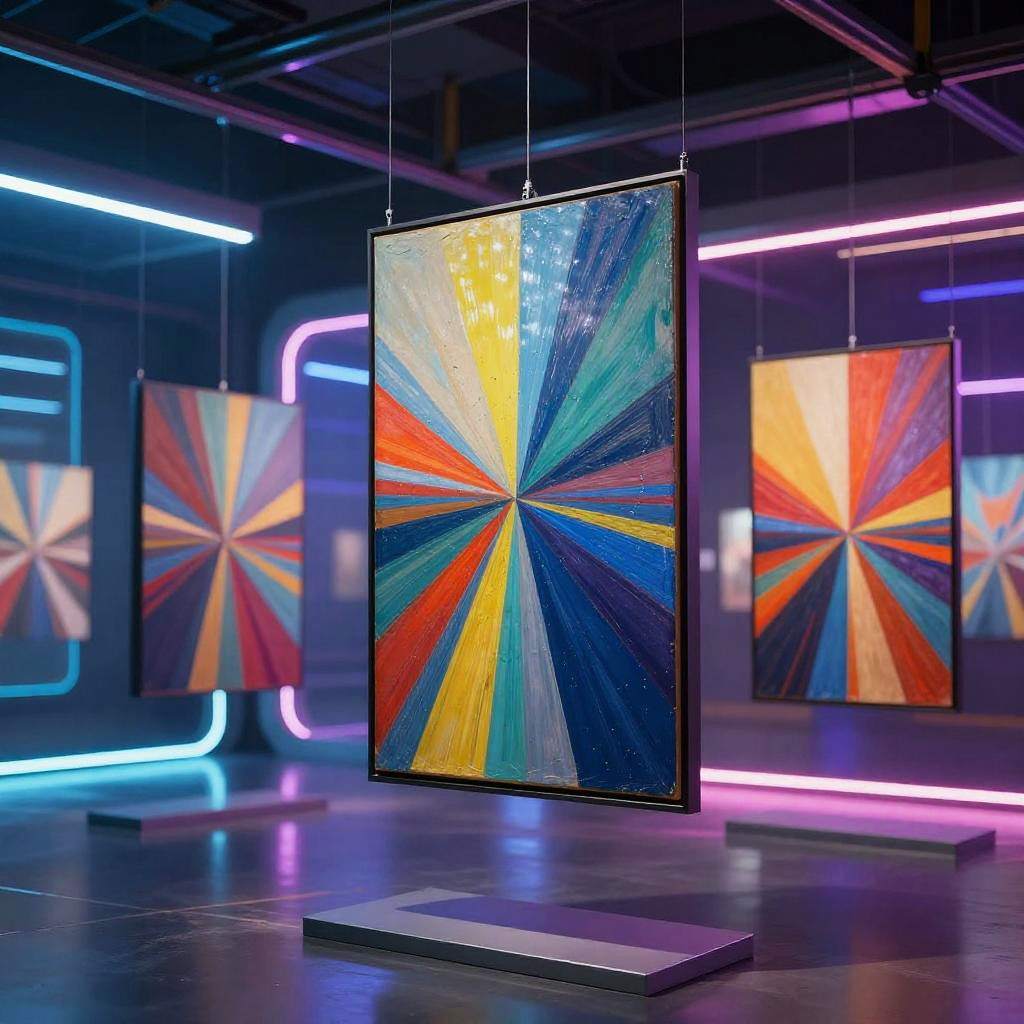 Photograph of a modern art gallery featuring four abstract, framed paintings with vivid, radial color patterns. The central painting, suspended by thin wires, showcases a bright, multi-colored burst with yellow, blue, red, and orange rays converging at the center. The background is dimly lit with neon blue and pink lights, creating a futuristic ambiance. The floor is polished dark gray, and the frames are sleek and black. Additional paintings are visible in the background, each displaying similar vibrant, radial designs. The scene is illuminated with dramatic lighting, emphasizing the colorful art.