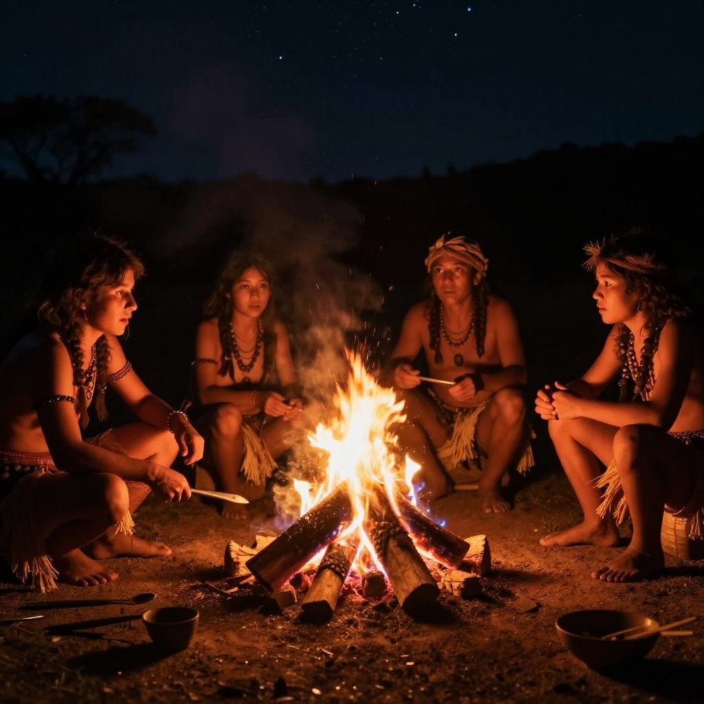 Prehistoric Nighttime Campfire Scene
