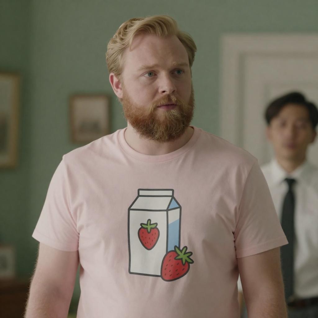 Photograph of a blonde, bearded man with a medium build wearing a light pink t-shirt with a milk carton and strawberry graphic. He stands in a blurred, green-walled room, looking to the side. In the background, a blurred figure in a white shirt and black tie is partially visible.