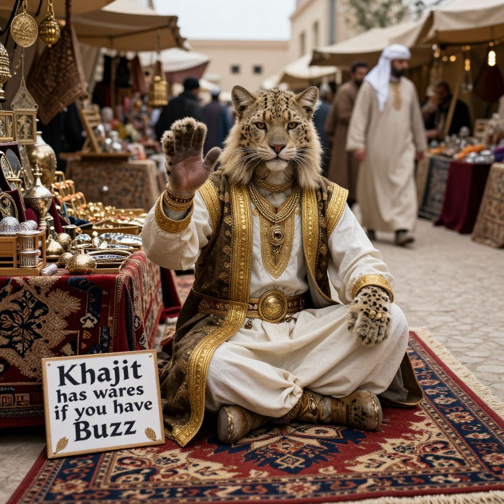 Breathtaking photography, masterpiece of art, realistic fur texture, imagine a bustling mediaval market with an arab atmosphere where a rough but goodhearted and refined but battle-hardened cat male human furry anthro hybrid with a snow leopard fur pattern in expensive gold-rimmed and finely patterned tunic clothing and jewelry is sitting on a masterwork patterned arabian carpet between piles and piles of fine antique artifacts and neatly arranged trinkets that he is selling, He is looking at the viewer and waving them to come closer, There is a sign propped up in the foreground that has \"Khajit has wares if you have Buzz\" in a gothic typeface written on it