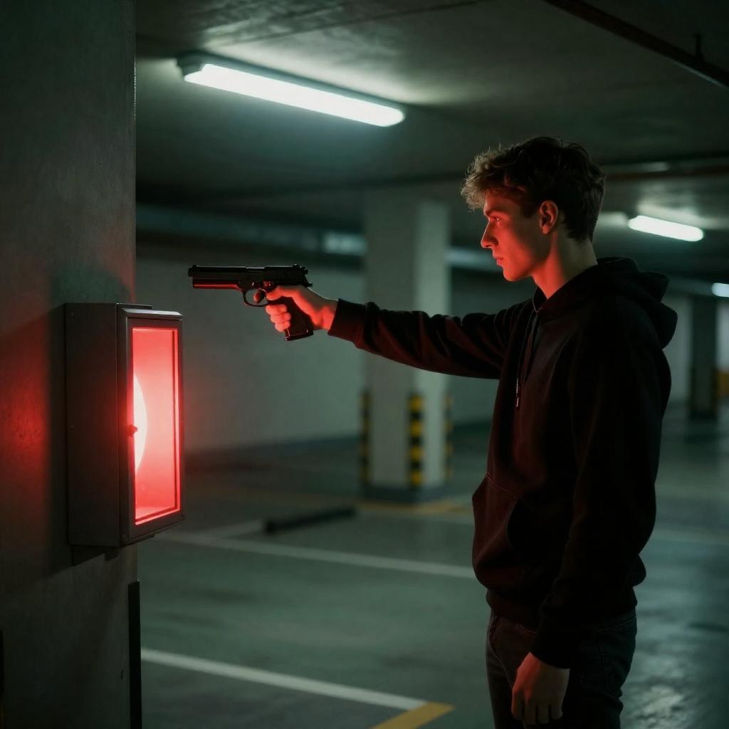 Photograph of a young man with short brown hair, wearing a black hoodie, standing in a dimly lit parking garage. He holds a gun in his right hand, facing a red-lit metal box on the left. The ceiling and pillars are illuminated with green and red lights, creating a dramatic, moody atmosphere.