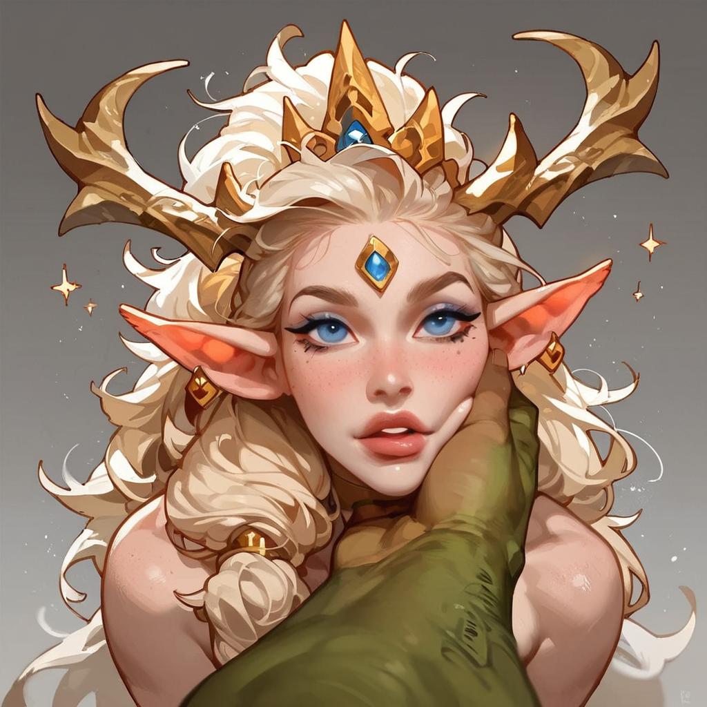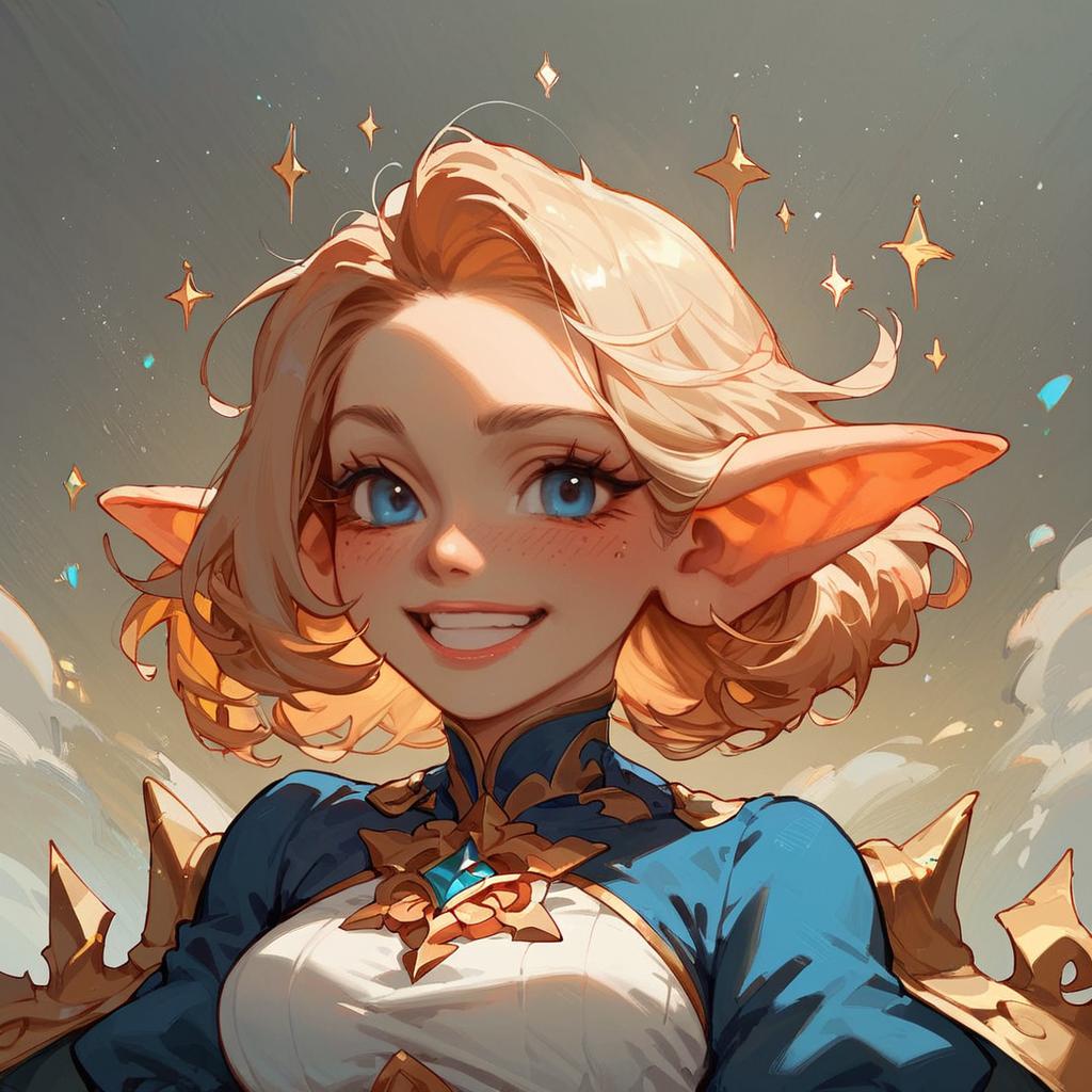Digital anime-style portrait of a smiling, blonde elf girl with large orange ears, blue eyes, and a blue and white outfit, surrounded by sparkling stars