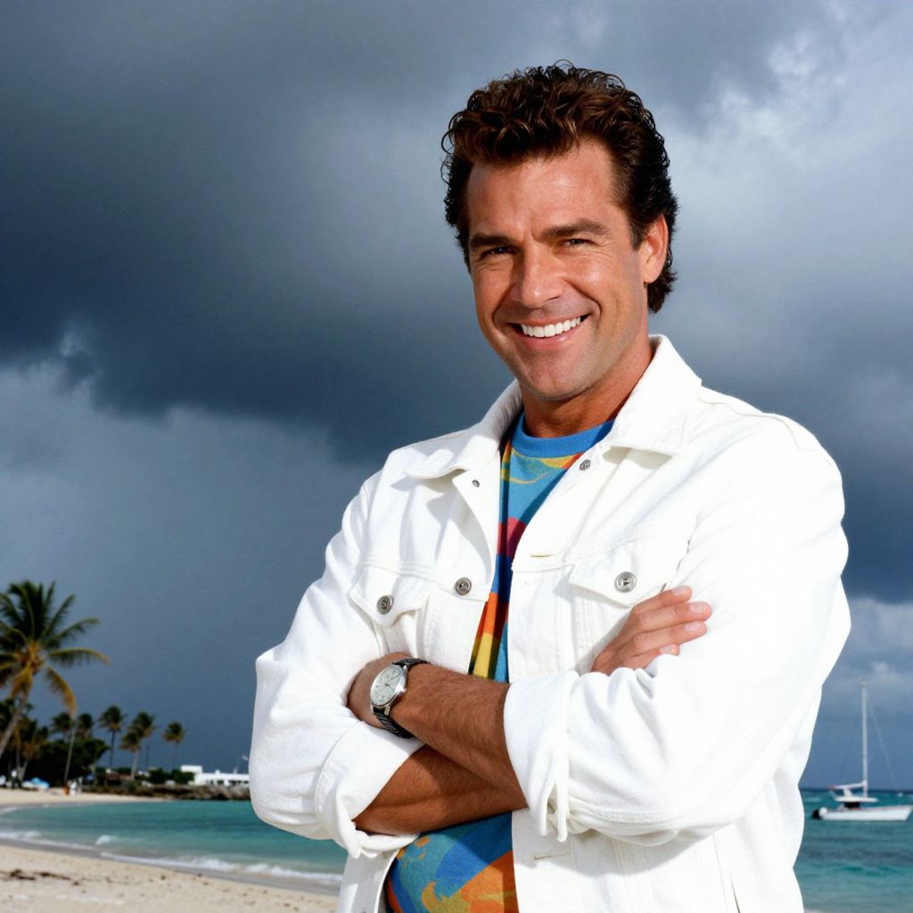 In the foreground, a man with a vibrant, foreboding smile stands confidently, his arms crossed and a watch adorning his wrist. He is dressed in a white jacket over a colorful t-shirt, exuding an 80's Miami Vice aesthetic. The background features a dramatic tropical storm, with dark, ominous clouds contrasting against the bright, vivid sky. The storm appears to be approaching, adding a sense of tension to the scene. In the distance, a serene beach with palm trees and a few boats can be seen, creating a stark contrast with the impending storm. The overall composition is dynamic, with the man in the foreground and the storm in the background, creating a sense of depth and anticipation.