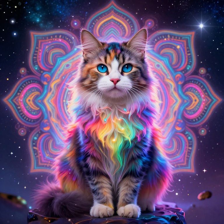 Psychedelic cat art showcasing a whimsical cat in a forest of glowing mushrooms, neon colors and fluid shapes, fractal-like fur patterns, mysterious and vibrant atmosphere, fantasy style