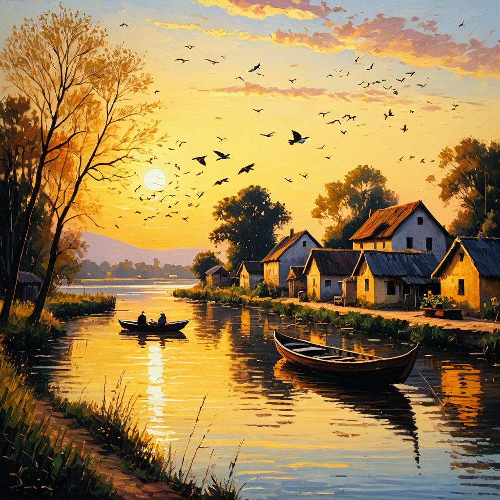A peaceful riverside village with a wooden boat floating on calm water, golden sunset hues with birds flying over, rendered in impressionist oil painting.