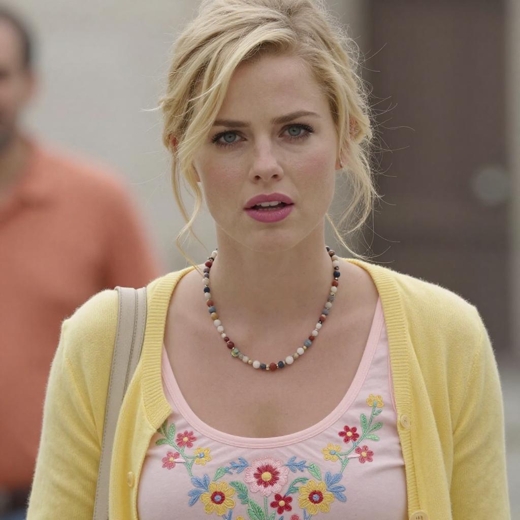 Photograph of a blonde woman with tousled hair, wearing a pink tank top with floral embroidery, a yellow cardigan, and a beaded necklace. She has light skin, blue eyes, and pink lipstick, looking directly at the camera with a slightly parted mouth. Background is blurred with hints of an orange shirt and outdoor light. Her expression is neutral but slightly intense.