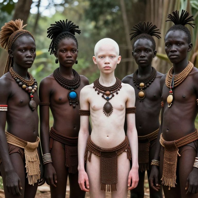 A group of people with dark skin and distinctive hairstyles, including an albino individual, stand together in a fantasy setting, possibly inspired by African mythology or folklore.