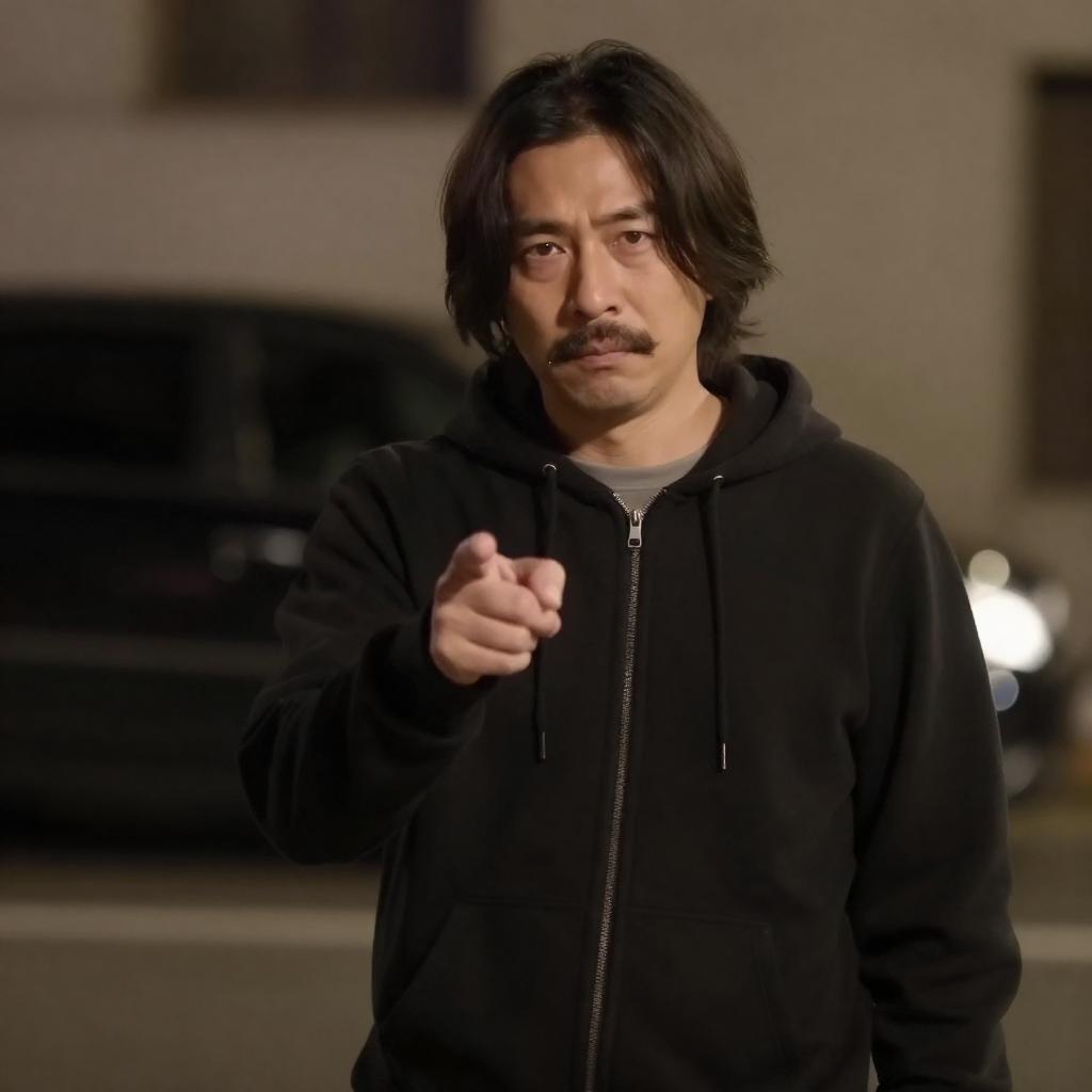 Photograph of a man with medium-length dark hair and a mustache, wearing a black hoodie over a gray shirt, standing in a dimly lit urban night setting. He points with his right hand, his expression serious. A blurred black car is in the background.