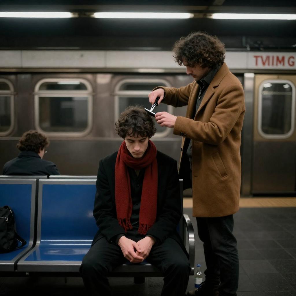 Photograph of two men in a dimly lit subway station. Man with dark hair, black suit, red scarf sits on bench, looking down. Second man with curly hair, brown coat, trims his hair with scissors, standing behind. Blue seats in background, one person sleeping, bottle on ground.