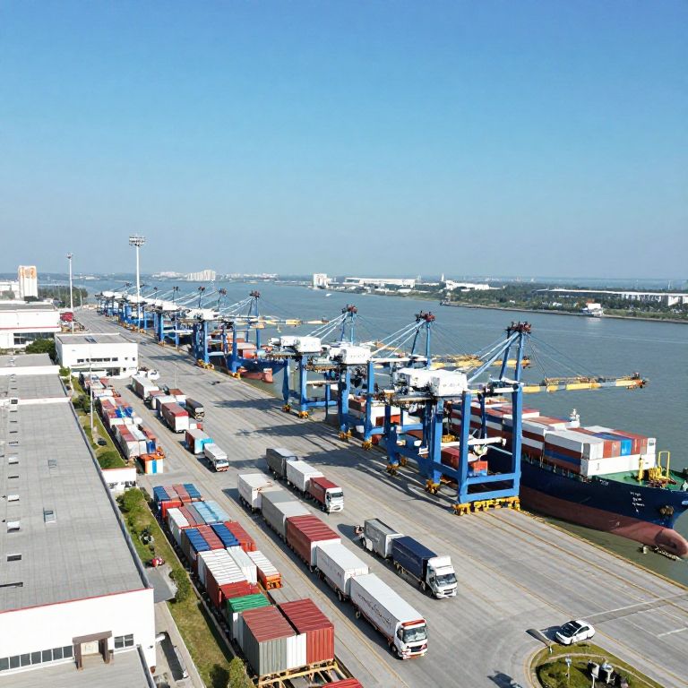 Aerial view of logistics industry factories with massive cargo ships and delivery trucks lined up in a busy port area under a clear blue sky.