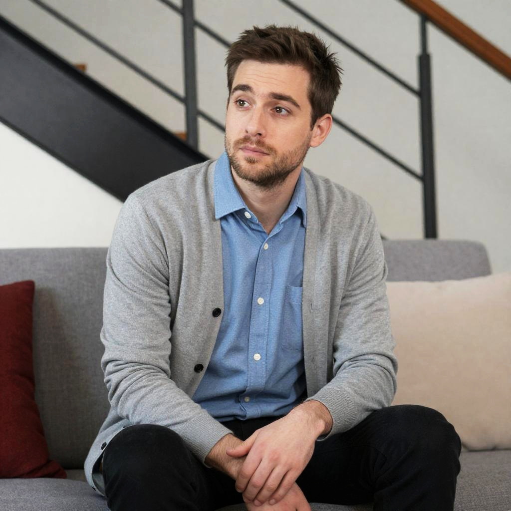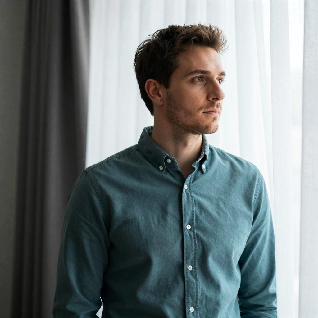 Photograph of a man with short brown hair and light beard wearing a navy blue sweater, standing next to a decorated Christmas tree featuring red poinsettias, pine cones, and white string lights. The man is looking to the right with a slight smile. Background includes closed white blinds.