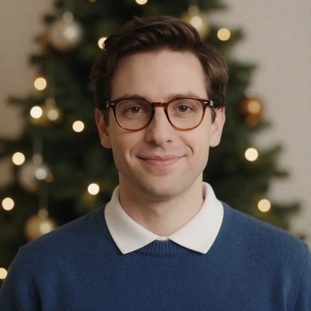 Photograph of a man with short brown hair and a light beard, smiling slightly, wearing a navy blue sweater. He stands to the right of a decorated Christmas tree with red poinsettias, pine cones, and white lights. Background has closed white blinds. Man looks to the right. Christmas tree is on the left.