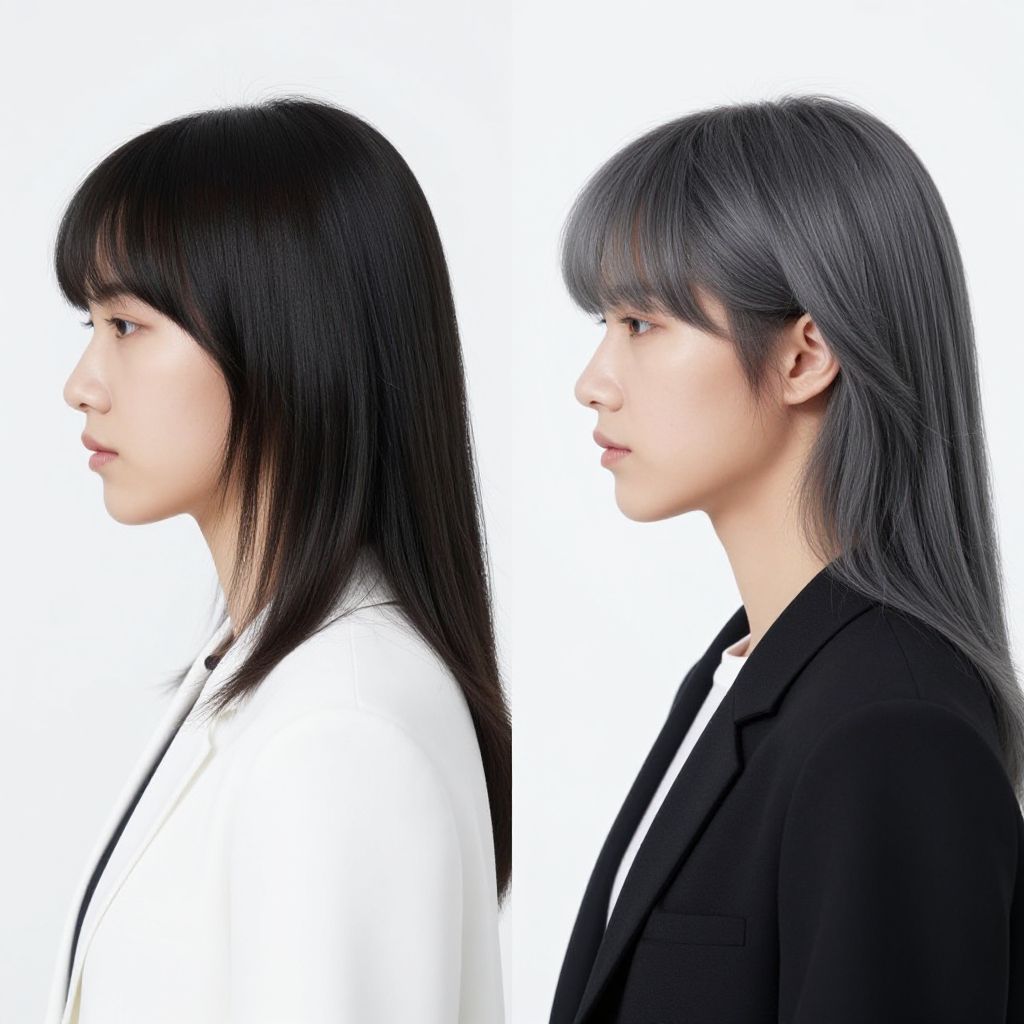 Photograph of two young Asian women in profile view, facing left and right respectively, against a white background. The woman on the left has long black hair and wears a white top, while the woman on the right has long gray hair and wears a black blazer with a white shirt. Both women have fair skin and straight hair. The image emphasizes their side profiles, highlighting their facial features and hairstyles. The contrast between their hair colors and clothing colors enhances the visual distinction between them.