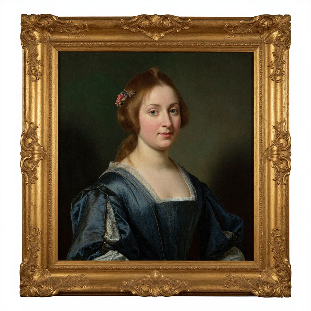 Elegant portrait of a woman by Pietro Antonio Rotari, framed in ornate gold detailing, featuring her with reddish-brown hair adorned with a small flower, wearing a dark blue dress with a light collar, set against a deep green background.