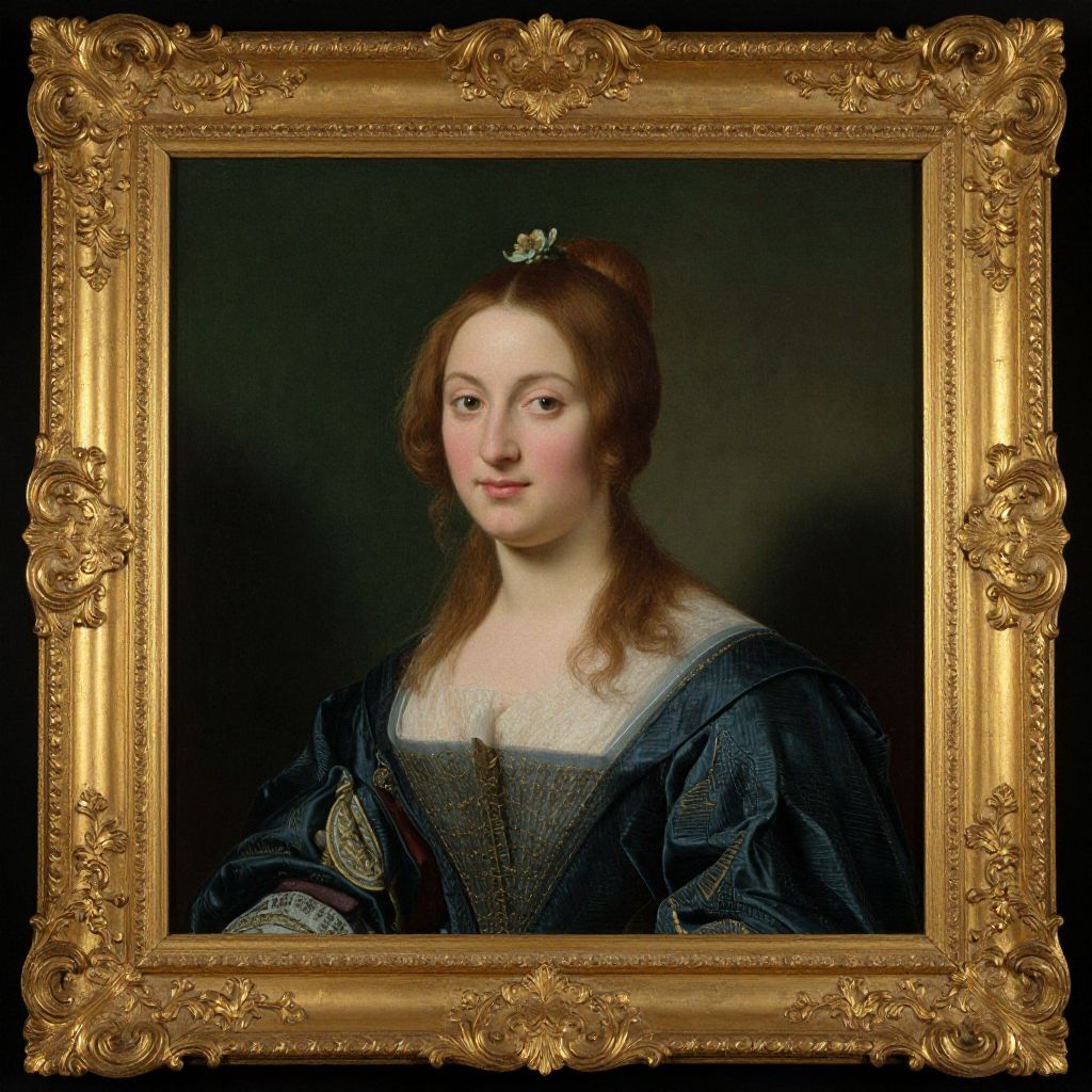 Classical portrait of a fair-skinned woman with brown hair, wearing a dark blue dress with lace, in an ornate gold frame.