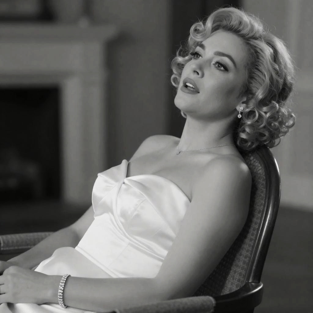 Black-and-white photograph of a woman with short, curly blonde hair, wearing a satin gown with a diamond bracelet, reclining in a chair. Her head is tilted back, mouth slightly open. Background is blurred. She has a relaxed, somewhat disinterested expression.