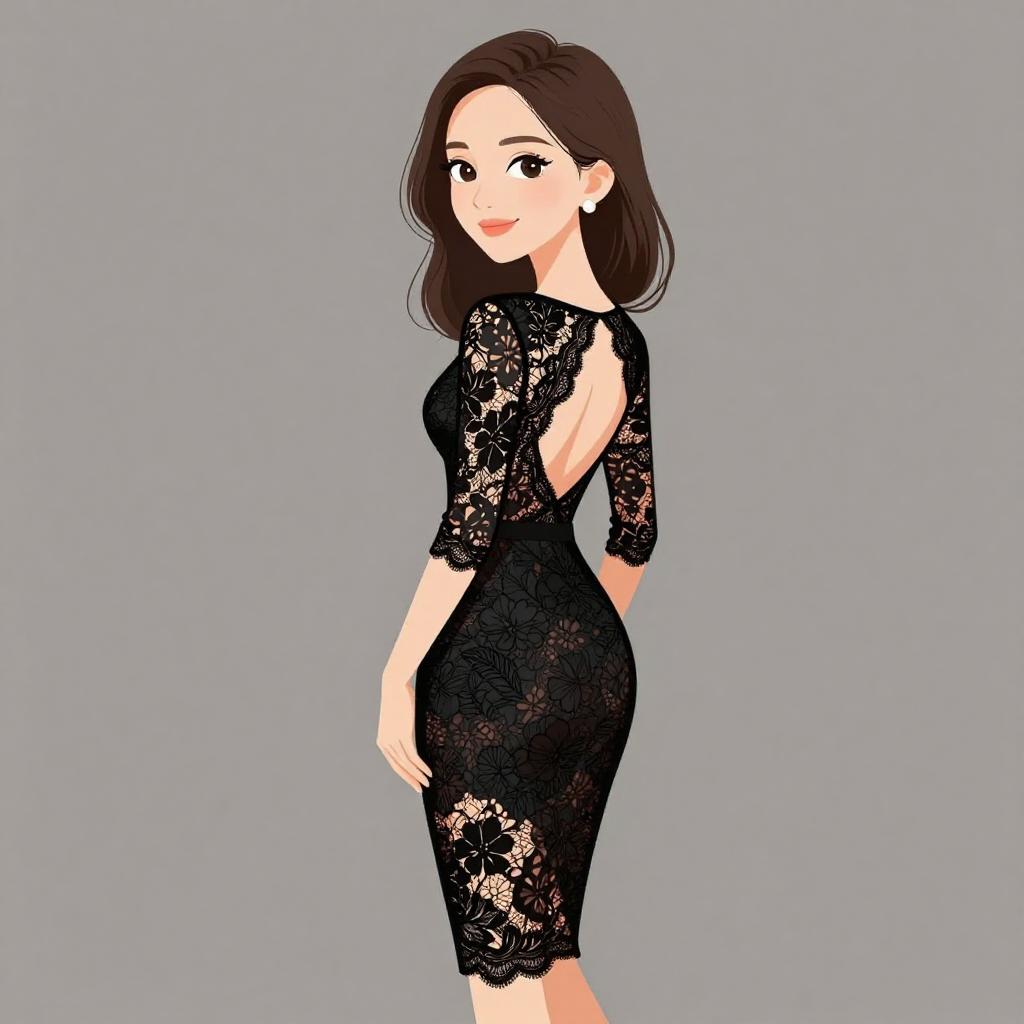 Woman with pretty face and pretty hair. smiling Woman, elegance, black lace dress with a floral pattern, three-quarter sleeves, open back design with a see-through lace panel, knee-length, bodycon fit. --sref 1467