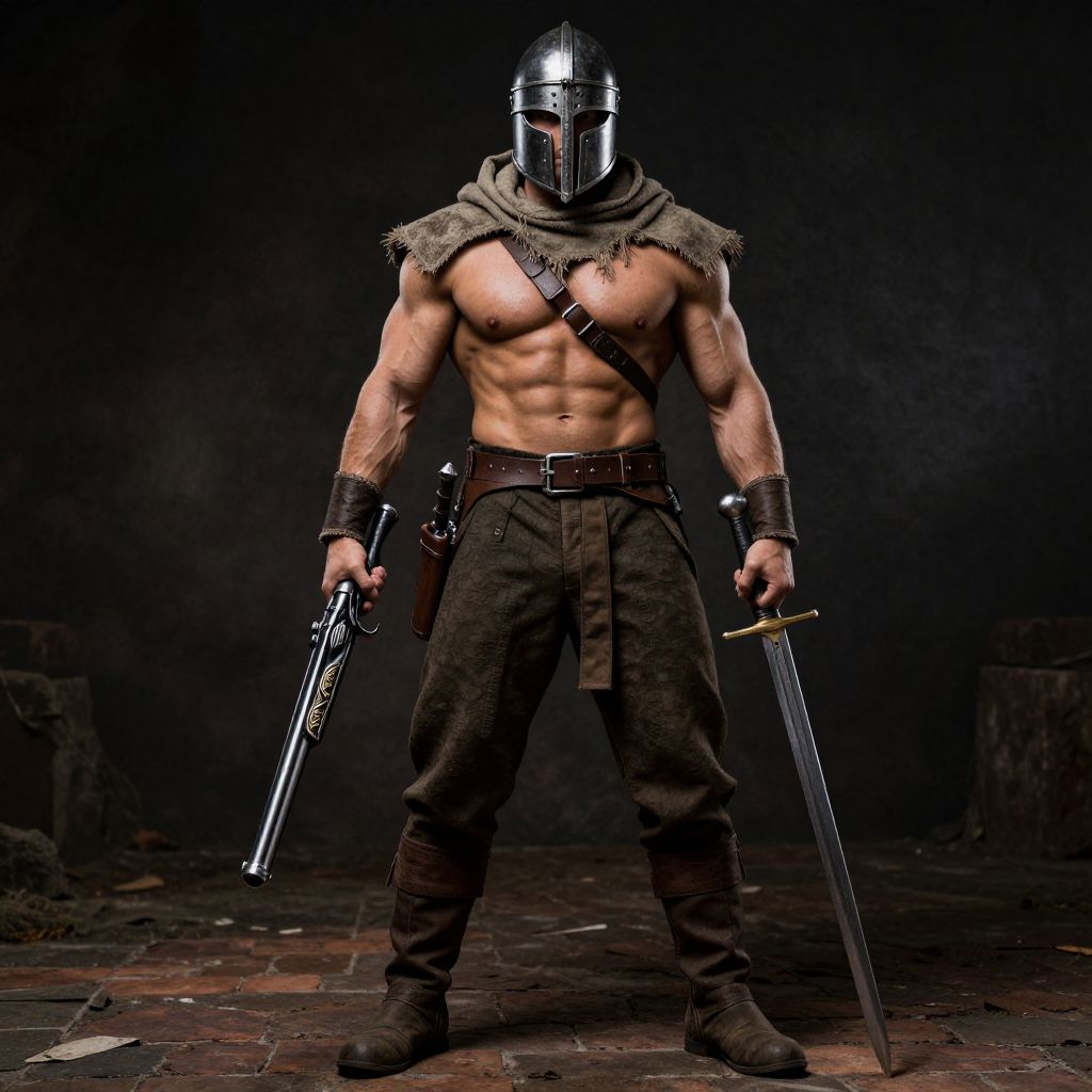 A muscular, well-built man in a medieval costume is standing on a brick surface, showcasing his physical strength and rugged appearance. He is wearing a heavy helmet, a weathered scarf, and sturdy boots. In his right hand, he holds a sleek, ornate gun, while in his left hand, he grips a long, sharp sword. The scene is set in a dark, brooding atmosphere with dim lighting, emphasizing his imposing presence and the medieval theme.
