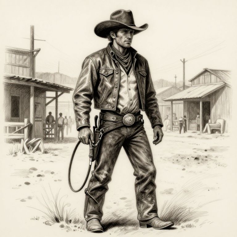 Cowboy pencil art of a rugged cowboy standing in a dusty western town, detailed shading and textures capturing the worn leather, hat, and horse reins, vintage sepia tone style with dynamic line work and subtle crosshatching