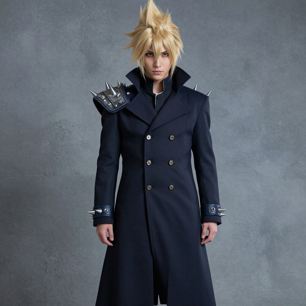 Photograph of a tall, slender man with spiky blonde hair, wearing a black, double-breasted coat with silver spikes on the shoulders and cuffs. His expression is serious, and he stands against a textured gray background. The coat's fabric appears sleek and slightly reflective, contrasting with the rugged spikes. His hands are relaxed by his sides. The overall style is edgy and futuristic, reminiscent of video game or anime characters. The lighting is even, highlighting the textures and details of the coat and his hair.