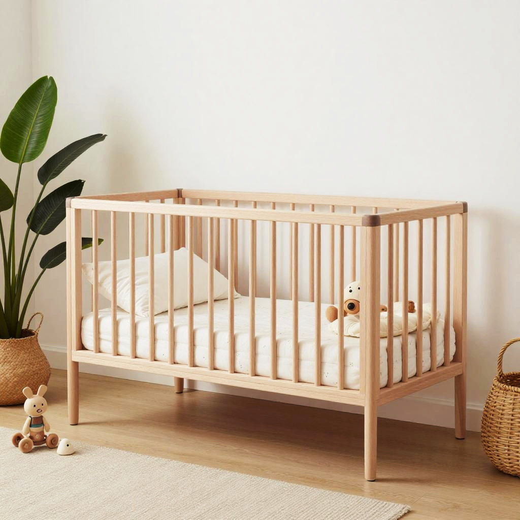 Modern babybett crafted from natural wood with minimalist design, surrounded by eco-friendly toys and breathable organic cotton bedding, set in a bright, airy room with green plants and soft neutral tones for a calming vibe.
