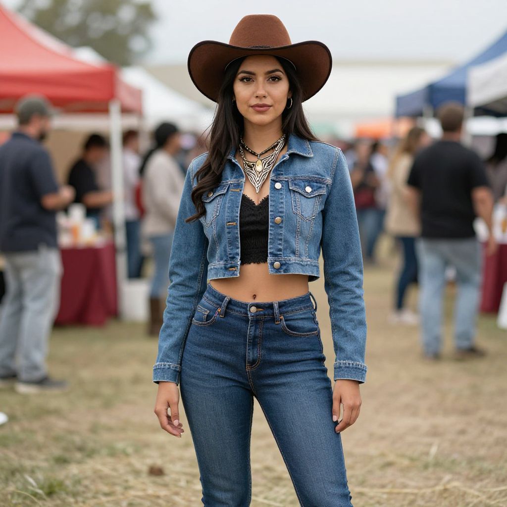 A woman dressed in a stylish cowgirl outfit featuring a cropped denim jacket, high-waisted jeans, and a wide brown cowboy hat stands confidently at a lively outdoor festival. The image captures the essence of Western cosplay and festival fashion with vibrant background activity and tents.