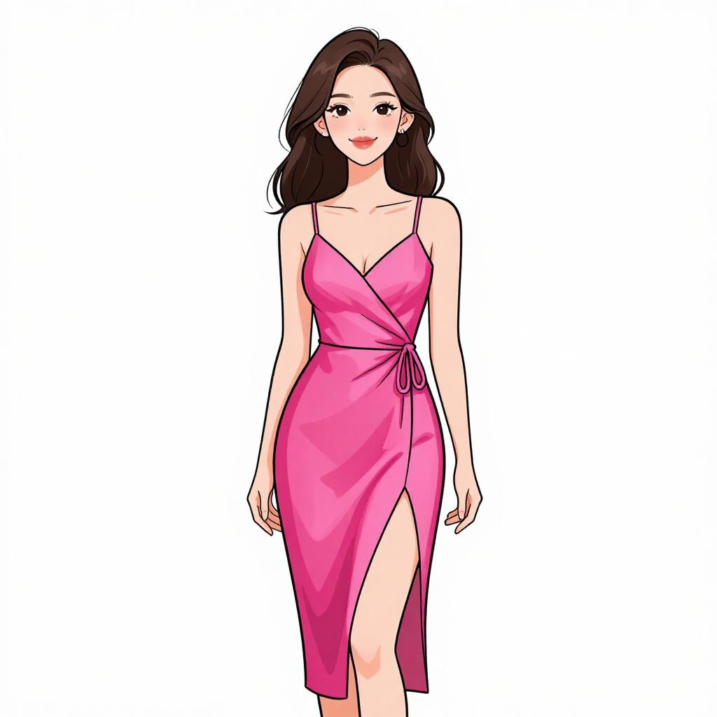 Woman with pretty face and pretty hair. smiling Woman, contemporary party wear, iridescent slip mini dress in soft pink with a subtle shimmer, thin spaghetti straps, V-neckline, straight silhouette, mid-thigh length, paired with burgundy crushed velvet ankle boots, delicate gold layered necklaces, minimalist studio background with a warm tone wooden floor and a light pink wall. --sref 1467