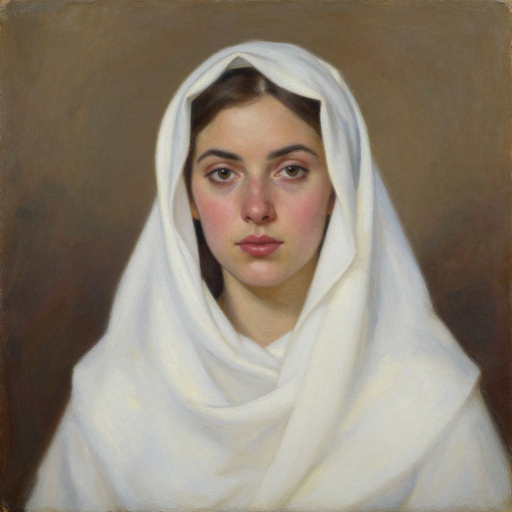 Realistic oil painting of a young woman with fair skin, dark eyes, and brown hair, wearing a white veil against a brown background.