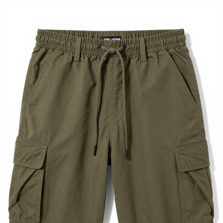 Olive-hued cargo pants featuring two large front pockets, elastic waistband with adjustable drawstring, and subtle branding at the center back, displayed against a clean white background.
