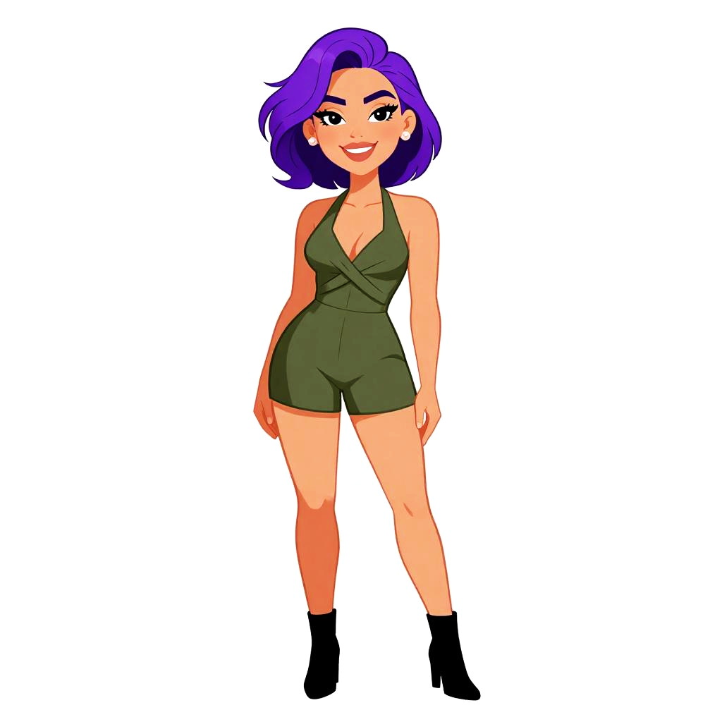 Illustration of a confident woman with purple hair styled in a casual updo, wearing an olive green halterneck playsuit featuring a twist detail at the front. She pairs the sleeveless, short-length outfit with black ankle boots with low heels and simple stud earrings. The woman has a warm smile and expressive eyes, standing against a plain white studio background.